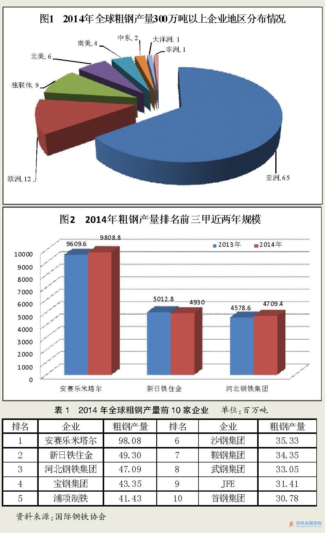 安賽樂米塔爾2014年粗鋼產(chǎn)量為9808.8萬噸,占入圍企業(yè)2014年合計粗鋼產(chǎn)量的8.15%,占世界粗鋼總量的5.89%;新日鐵住金2014年粗鋼產(chǎn)量為4930.0萬噸,占入圍企業(yè)2014年粗鋼產(chǎn)量的4.09%,占世界粗鋼總量的2.96%;河北鋼鐵集團2014年粗鋼產(chǎn)量為4709.4萬噸,占入圍企業(yè)2014年粗鋼產(chǎn)量的3.91%,占世界粗鋼總量的2.83%。